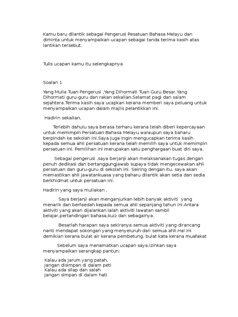 Kamu Baru Dilantik Sebagai Pengerusi Pesatuan Bahasa Melayu Dan Diminta Untuk Menyampaikan Ucapan Sebagai Tanda Terima Kasih Atas Lantikan Tersebut Pdf